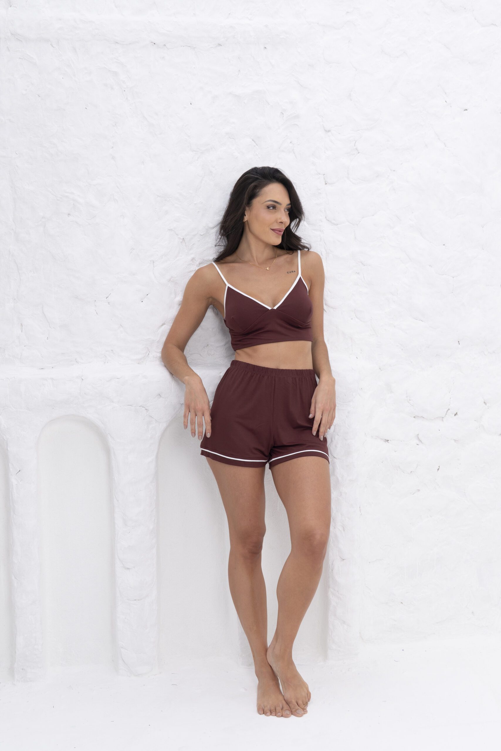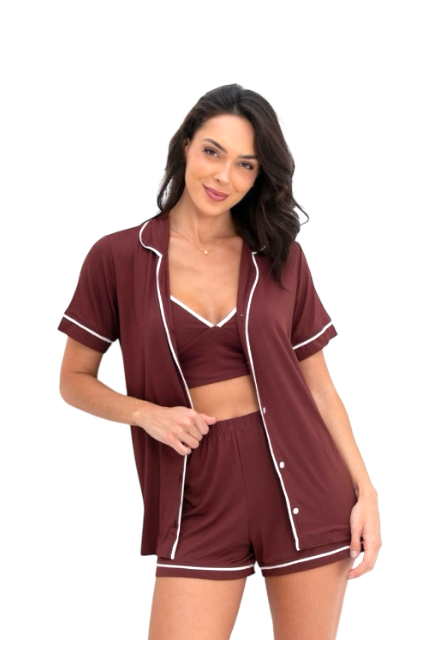 A cor marrom foi escolhida para trazer sofisticação e aconchego, permitindo combinações com robes, pantufas e acessórios neutros. O conjunto tem um corte atual que valoriza a silhueta sem marcar excessivamente — perfeito para quem quer conforto com um toque de elegância.